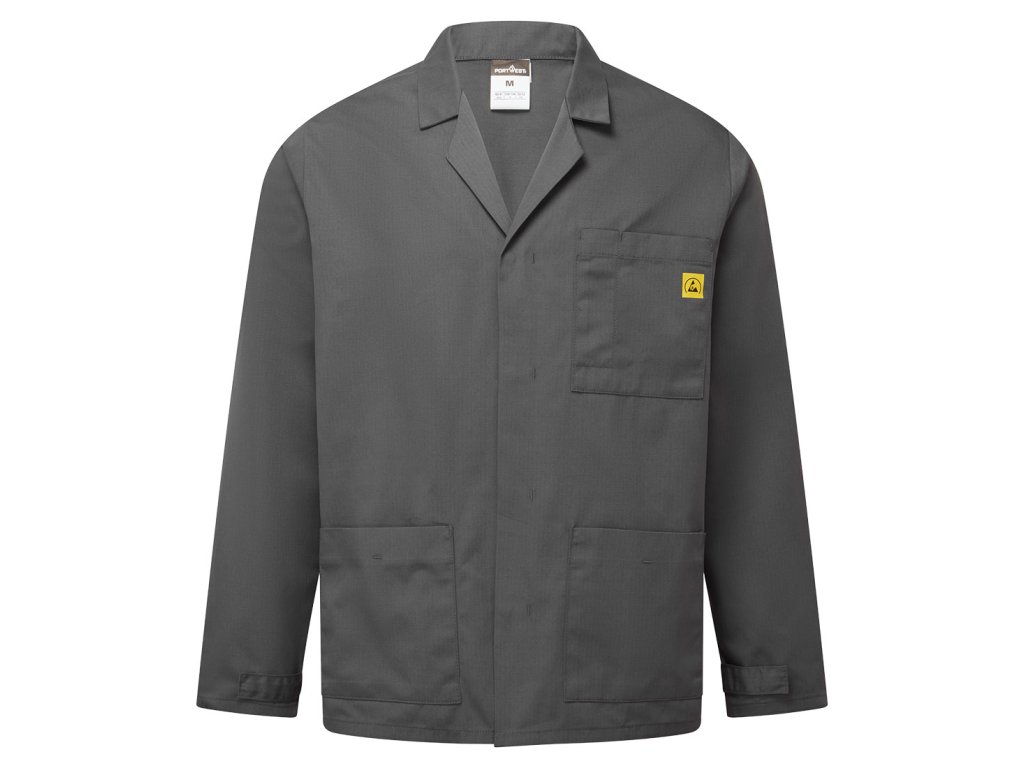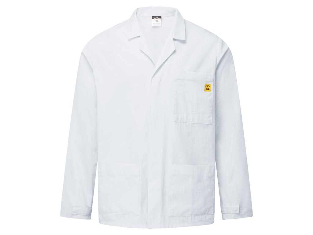 Profesionální antistatická ESD laboratorní bunda s certifikací EN 61340-5-1 pro ESD provozy.