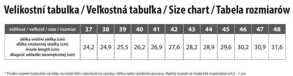 | Velikost | 37 | 38 | 39 | 40 | 41 | 42 | 43 | 44 | 45 | 46 | 47 | 48 |