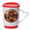 Bílý hrnek s uchem ve tvaru srdce a červeným silikonovým víčkem a podšálkem o objemu 360 ml.