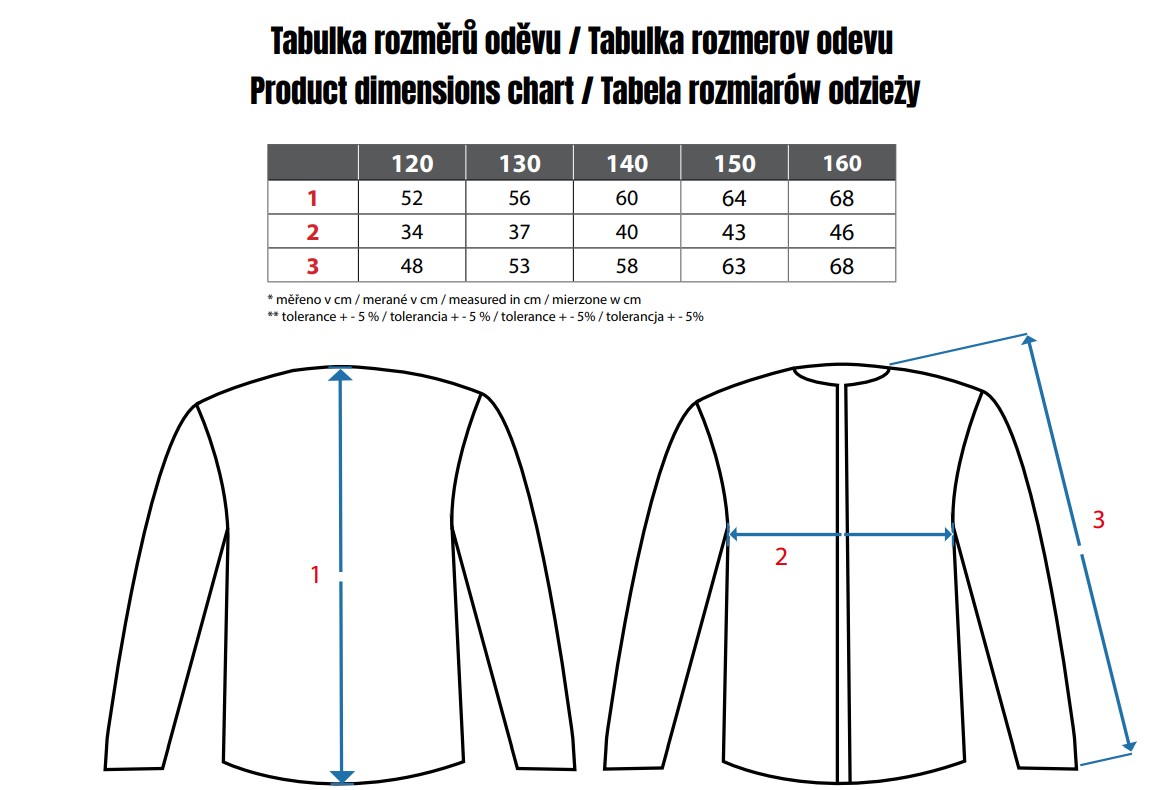 - Velikosti: 120 cm (6-7 let), 130 cm (7-8 let), 140 cm (9-10 let), 150 cm (11-12 let), 160 cm (13-14 let)