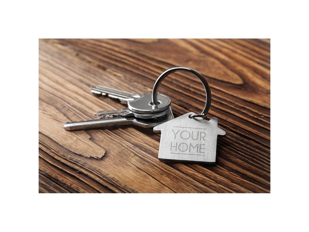Minimalistická hliníková klíčenka HOMIER ve tvaru domu, navržená jako praktický doplněk i tematický dárkový předmět.