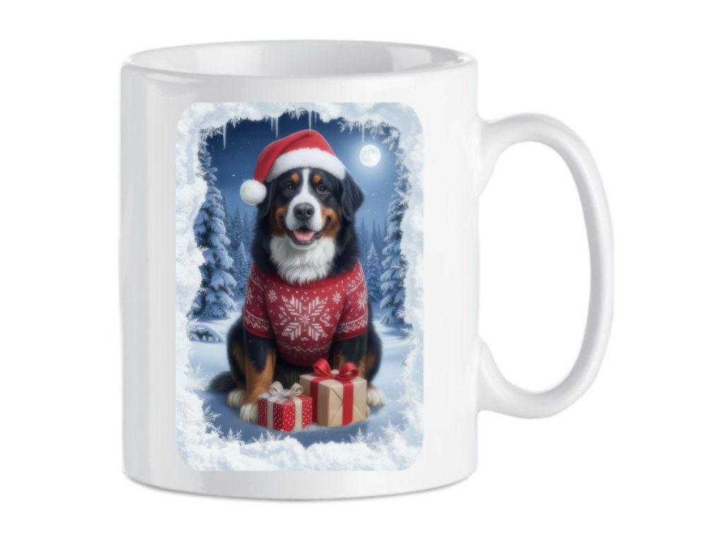 Keramický hrnek s vánočním motivem Bernského salašnického psa v čepici a pleteném svetru je originálním dárkem pro milovníky psů i vánoční atmosféry. Lesklý bílý povrch krásně zvýrazní jasný a detailní potisk tvořený trvanlivou termosublimací.
