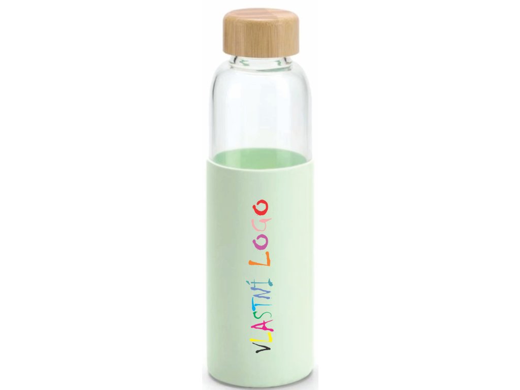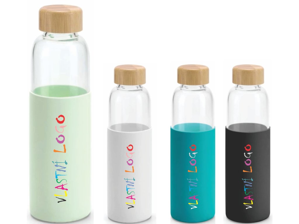- borosilikátová skleněná láhev s bambusovým víkem a silikonovým pouzdrem