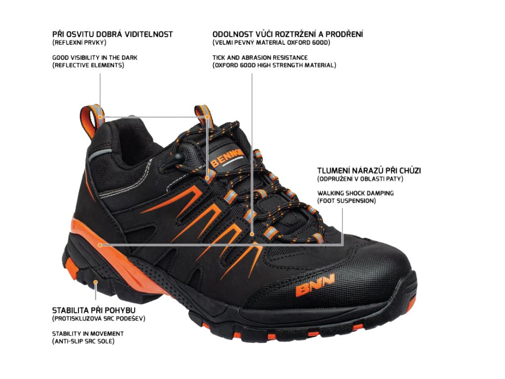 Voděodolná, nemetalická pracovní polobotka sportovního vzhledu. Svršek obuvi je vyroben z materiálu Action nubuck a z velmi pevné, vůči roztržení a prodření odolné, textilie OXFORD 600 D. Bota má reflexní prvky, které způsobí, že při osvitu budete viděni za šera a tmy. Při práci v terénu oceníte také odpružení v oblasti paty, které tlumí nárazy způsobené chůzí a dále také protiskluzovou SRC podešev, jež vám zajistí dobrou stabilitu při všech pohybových aktivitách. Obuv je taktéž odolná vůči kontaktnímu teplu a vůči pohonným látkám.