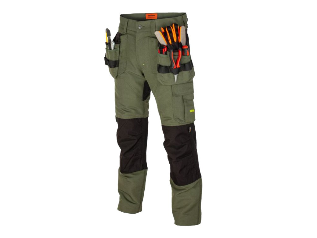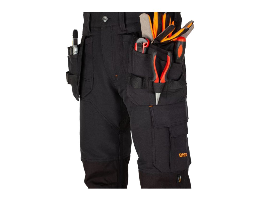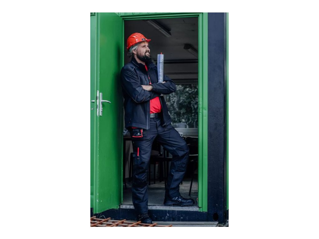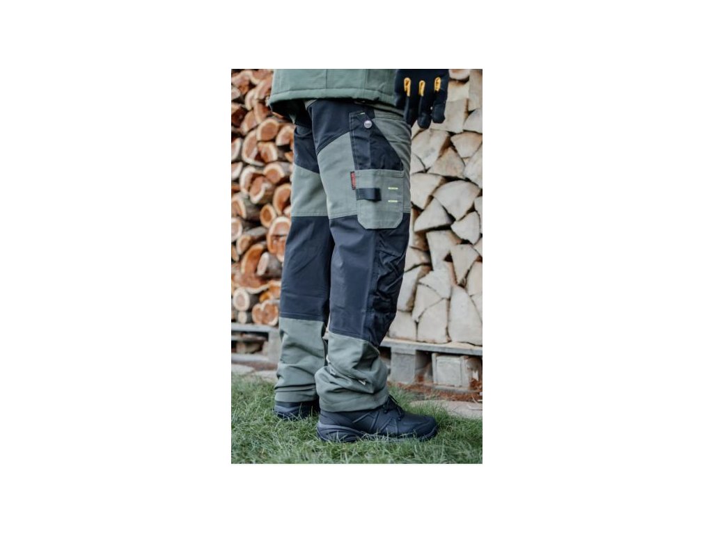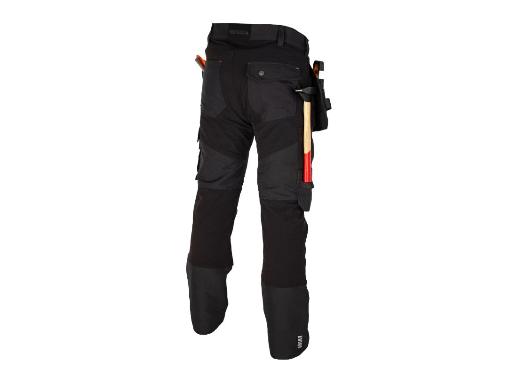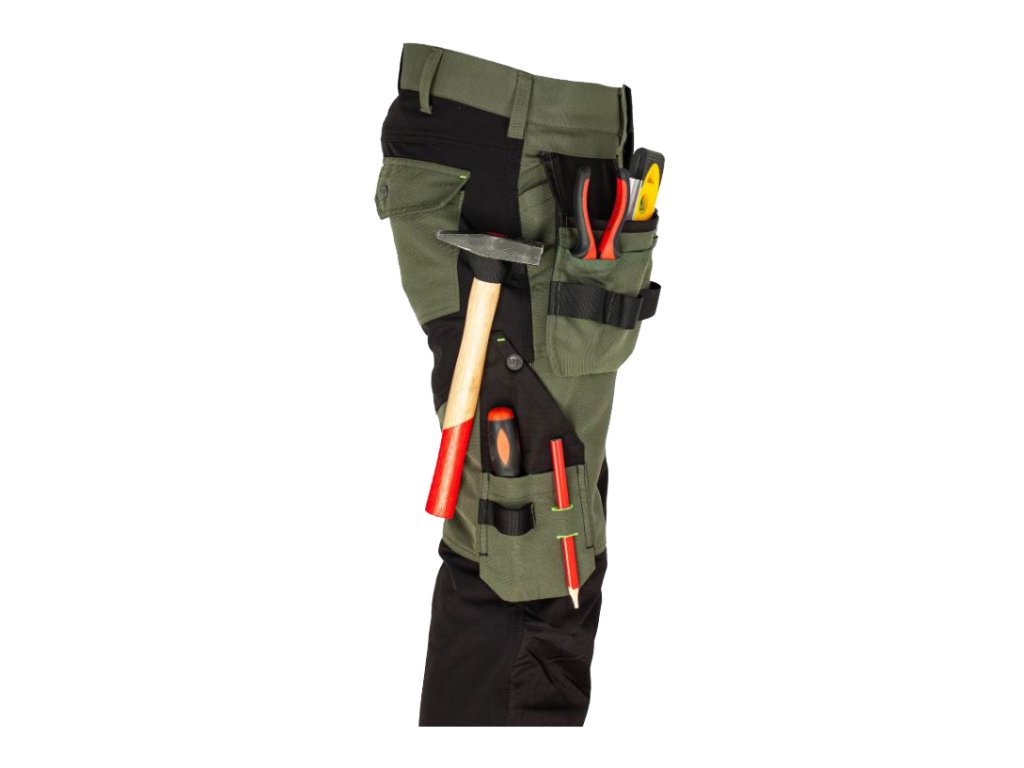 Veľmi pevný, odolný materiál, v oblasti sedadla a rozkroku veľmi pružné namáhané časti vo vreckách a kolenách vystužené materiálom Cordura 500D, ktorý sa vyznačuje vysokou pevnosťou a odolnosťou voči oderu a iným mechanickým poškodeniam vodoodpudivou úpravou. Reflexné prvky na nohách pre lepšiu viditeľnosť, odnímateľné vrecká na náradie, vrecká na skrutkovače, klince a kladivá, pútka na zavesenie náradia, vrecko na skladací meter a mobilný telefón, oblasť kolien s vreckom na nákolenníky. Nastaviteľná dĺžka nohy, tento výrobok spĺňa požiadavky normy EN ISO 13688:2013/A1:2021.