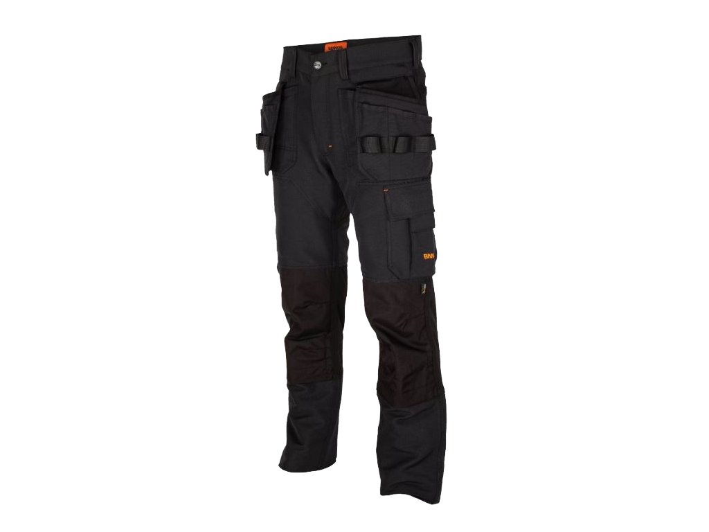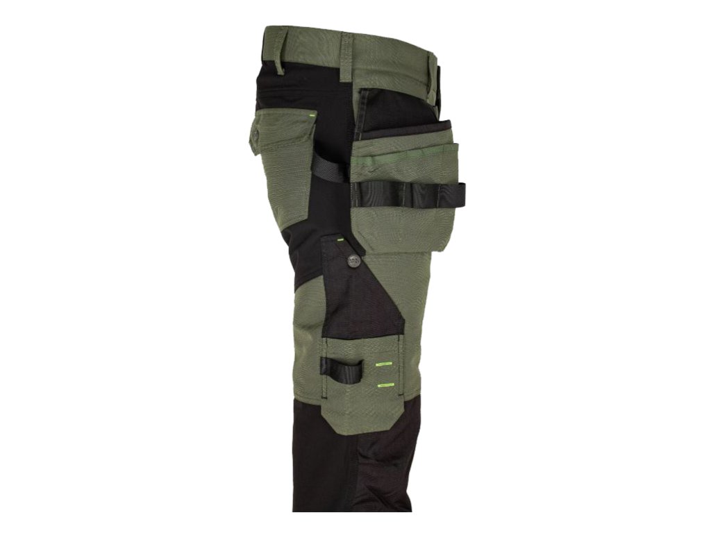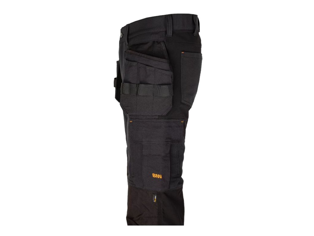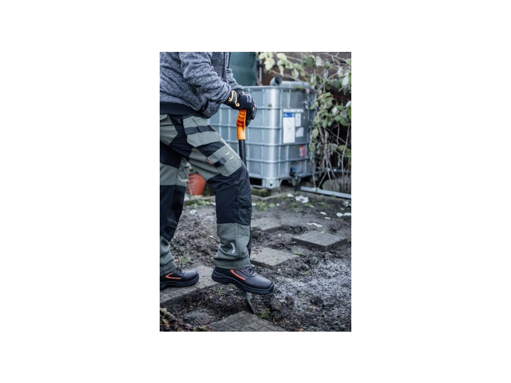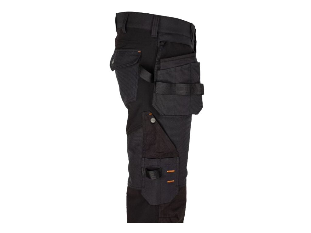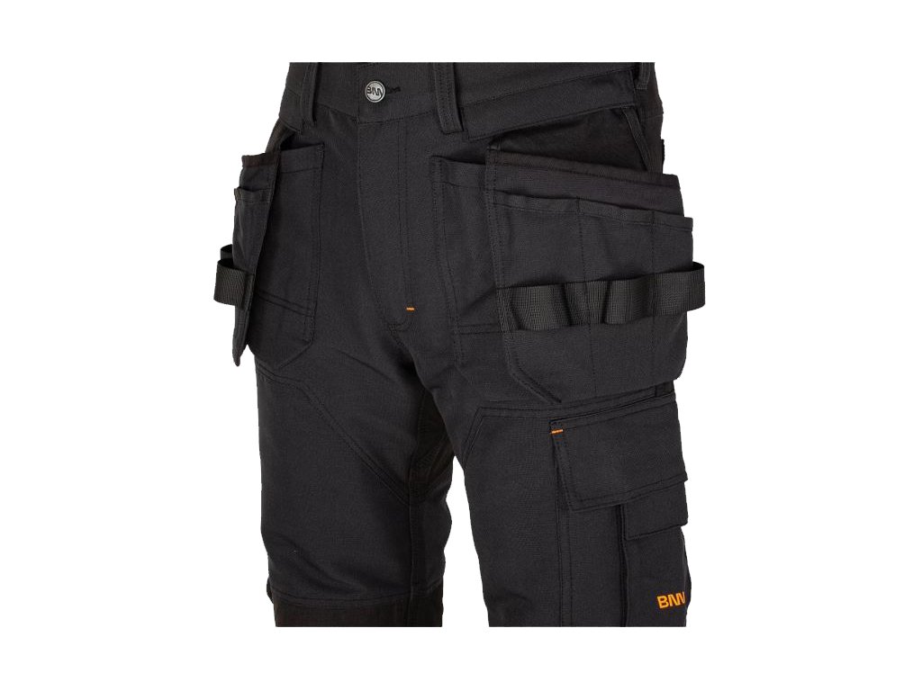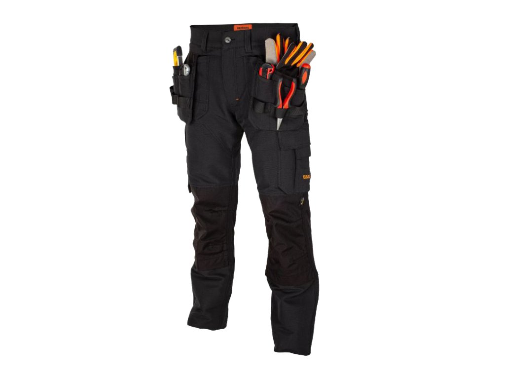 Veľmi pevný, odolný materiál, v oblasti sedadla a rozkroku veľmi pružné namáhané časti vo vreckách a kolenách vystužené materiálom Cordura 500D, ktorý sa vyznačuje vysokou pevnosťou a odolnosťou voči oderu a iným mechanickým poškodeniam vodoodpudivou úpravou. Reflexné prvky na nohách pre lepšiu viditeľnosť, odnímateľné vrecká na náradie, vrecká na skrutkovače, klince a kladivá, pútka na zavesenie náradia, vrecko na skladací meter a mobilný telefón, oblasť kolien s vreckom na nákolenníky. Nastaviteľná dĺžka nohy, tento výrobok spĺňa požiadavky normy EN ISO 13688:2013/A1:2021.