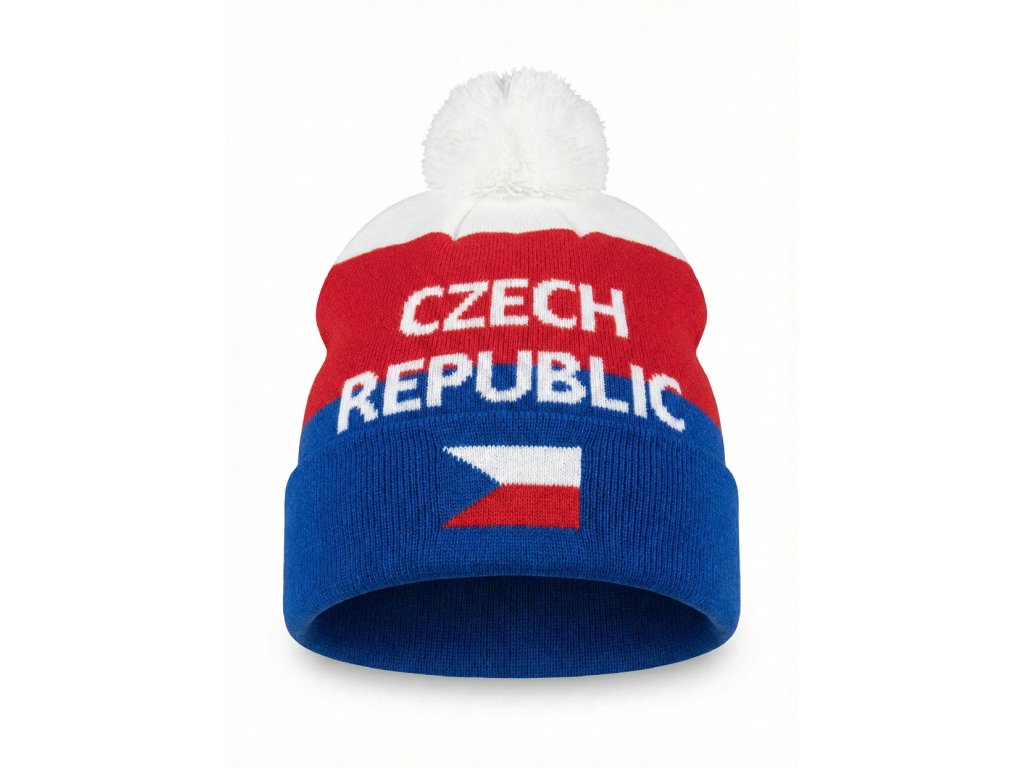 Sportovní zimní čepice v národních barvách s bambulí, ideální pro fanoušky českého sportu a zimní aktivity.