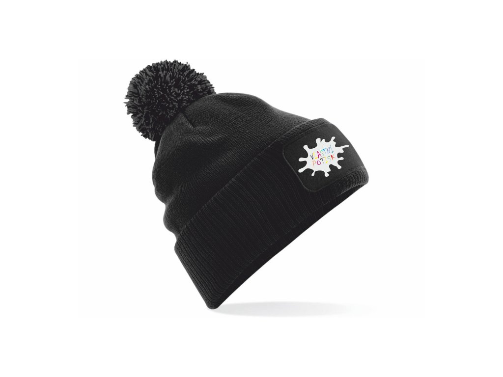stylová zimní čepice s bambulí, žebrovaným lemem a bavlněnou nášivkou pro vlastní potisk