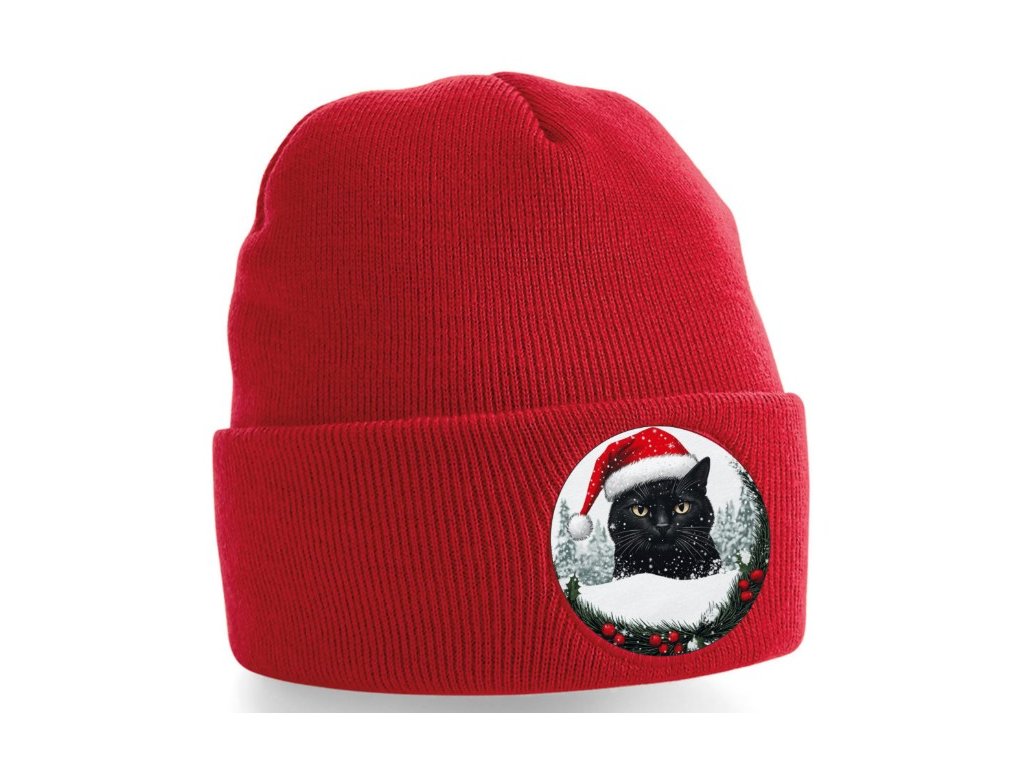 Hřejivá zimní čepice s vánoční kruhovou nášivkou černého kocoura. Měkký polyakryl, ohrnutý lem a univerzální velikost.