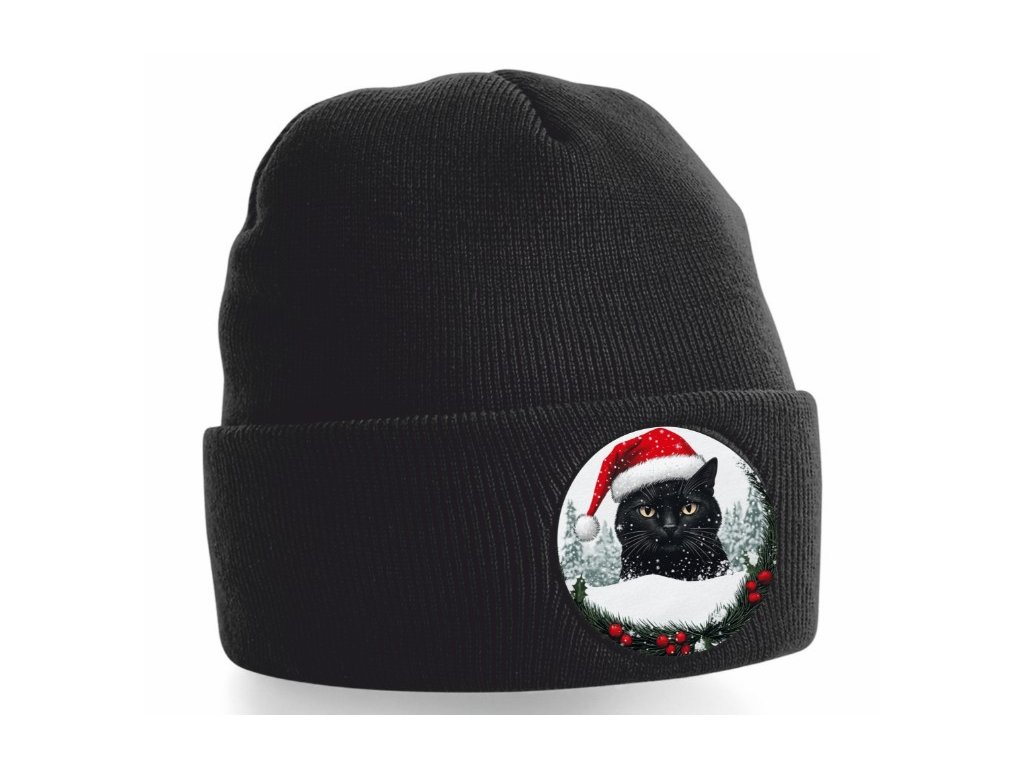Stylová zimní čepice s vánočním potiskem černého kocoura ve vánoční čepici. Skvělá volba pro milovníky koček, vánoční trhy, firemní akce, zimní focení i každodenní nošení v chladném období. Hřejivý 100% polyakryl je měkký na omak, dobře drží tvar a poskytuje pohodlné teplo po celou zimu.