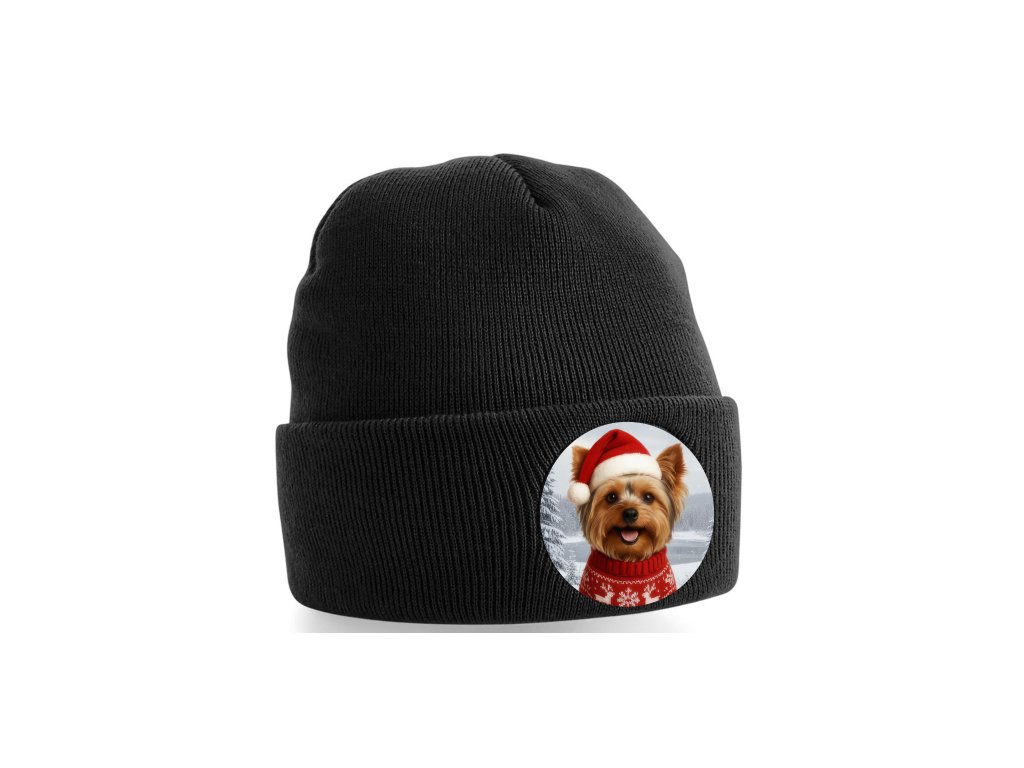 Hřejivá zimní čepice s vánoční kruhovou nášivkou potisklou jorkšírským teriérem v čepici a svetru. Měkký polyakryl, ohrnutý lem, univerzální velikost.
