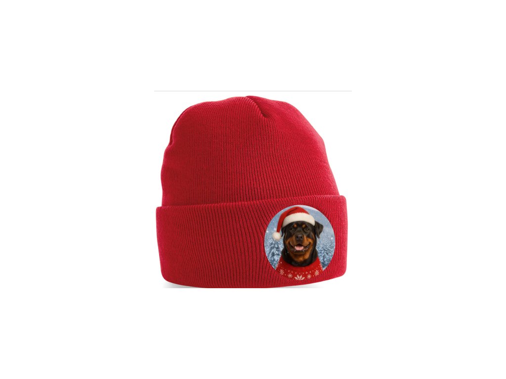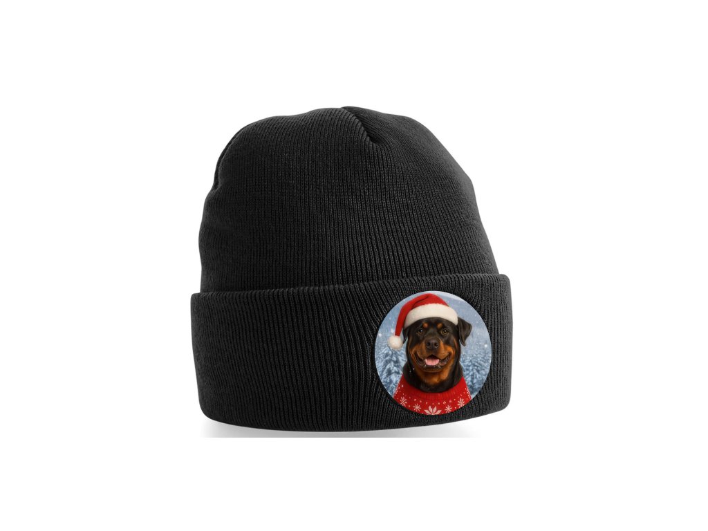 Užijte si veselé, pohodové a stylové Vánoce s originální zimní čepicí zdobenou nášivkou vánočního Rotvajlera. Dodá vašemu zimnímu outfitu šmrnc, úsměv a sváteční atmosféru.